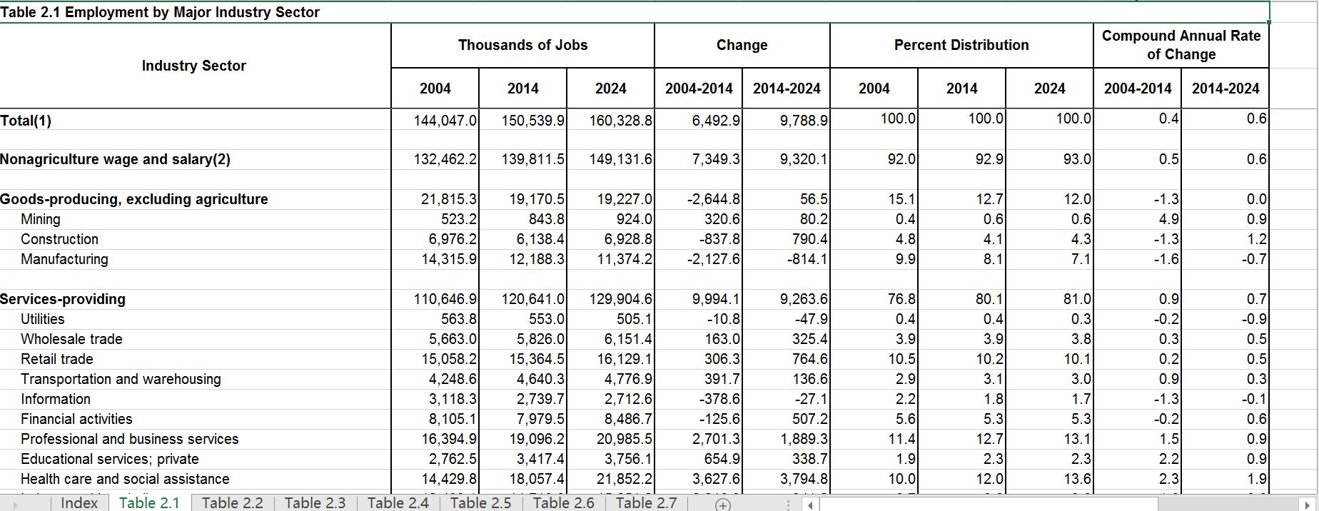 美国的Employment Projections program的完整表格,查数据时找的,分享给大家。另安利U.S. Bureau of Labor Statistics~