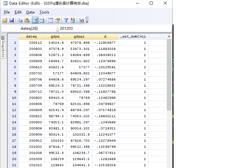 黃河泉 发表于 2016-11-2 17:41 你是不是没宣告资料为时间序列?例如 tsset xxx? 你的时间变量 dateq 看起来不是 Stata 的格式! 此外,计算 ...