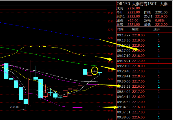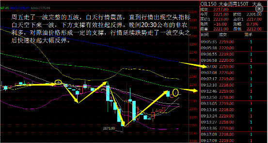 从30分钟周期和60分钟周期级别,上周受大非农数据利多的影响,对原油价格的跌势形成一定的支撑。从MACD均线指标看5日均线上穿10日均线,白天看好一波反弹。上方受空头压制,注意关注上方压力位2220-2250,下方支撑位2170-2150.(今日具体操作建议私聊本人)