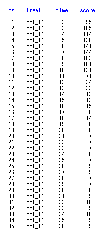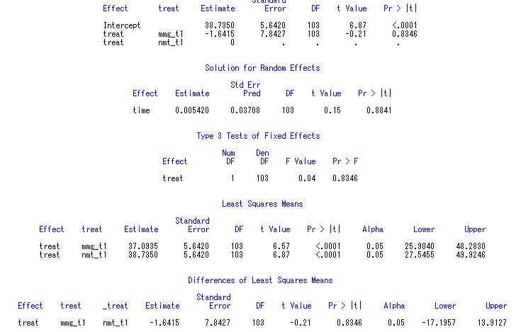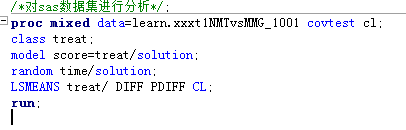 我想比较一下两种不同treat配对差值的可信区间,score是应变量,并将time作为随机效应处理,现在的问题是我如何告诉sas我要处理的是配对的数据?