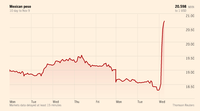 Still, there are some stand out moves in the market. The Mexican peso is off the session’s record lows but still down 9.4 per cent to 20.0230 per dollar, on worries Mr Trump’s anti trade stance will badly hit the US’s southern neighbour.