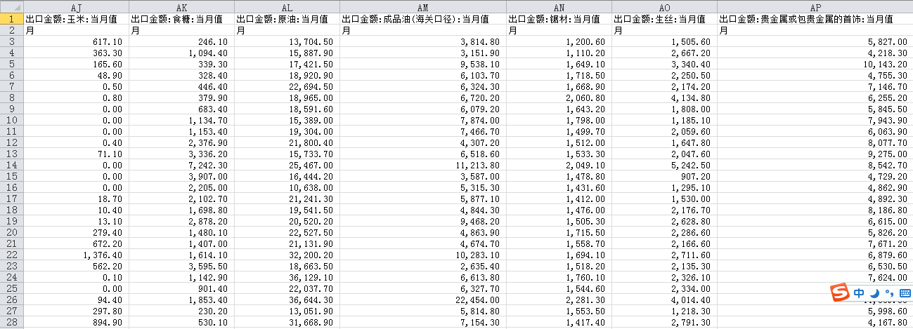 1995年-2016年中国主要进出口商品数量金额明细月度数据(按产品类别分类)具体产品包括: