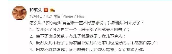 或许还有些站在罗尔的支持者说,罗尔还是很爱他的女儿的。事后罗尔不是也承认错误,在公众号上发布了声明,要把多余的捐款全数退还给打赏的人们吗?