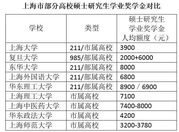 事实上,也并非所有的上海高校都有相对高额的学业奖学金。譬如,华东政法大学硕士研究生人均奖学金额度为4100元,上海师范大学人均额度则是介于3200元和3780元之间,均与上海大学的水平相近。