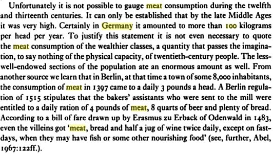 别的也就罢了 “以德国为例,中世纪后期每人每年的肉食达100公斤以上” 这真是太可怕了