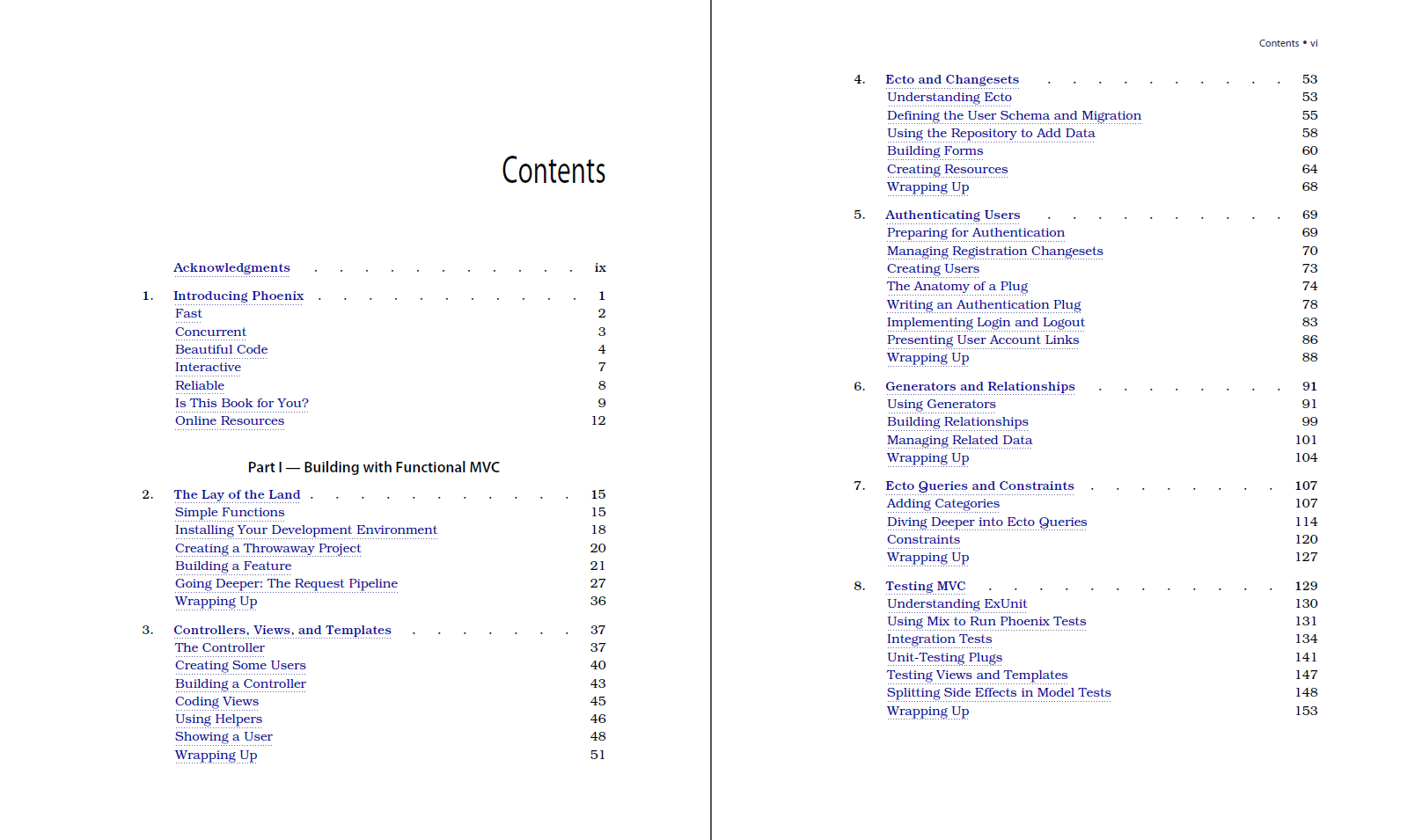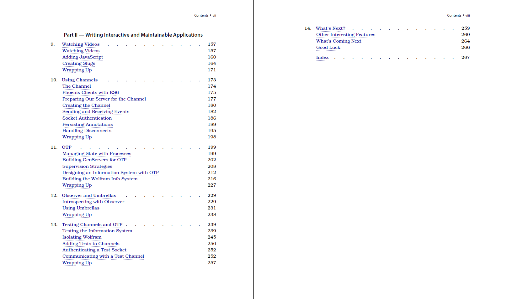 The best way to learn Phoenix is to code, and you’ll get to attack some interesting problems. Start working with controllers, views, and templates within the first few pages. Build an in-memory repository, and then back it with an Ecto database layer. Learn to use change sets and constraints that keep readers informed and your database integrity intact. Craft your own interactive application based on the channels API for the real-time, high-performance applications that this ecosystem made famous. Write your own authentication components called plugs, and even learn to use the OTP layer for monitored, reliable services. Organize your code with umbrella projects so you can keep your applications modular and easy to maintain.