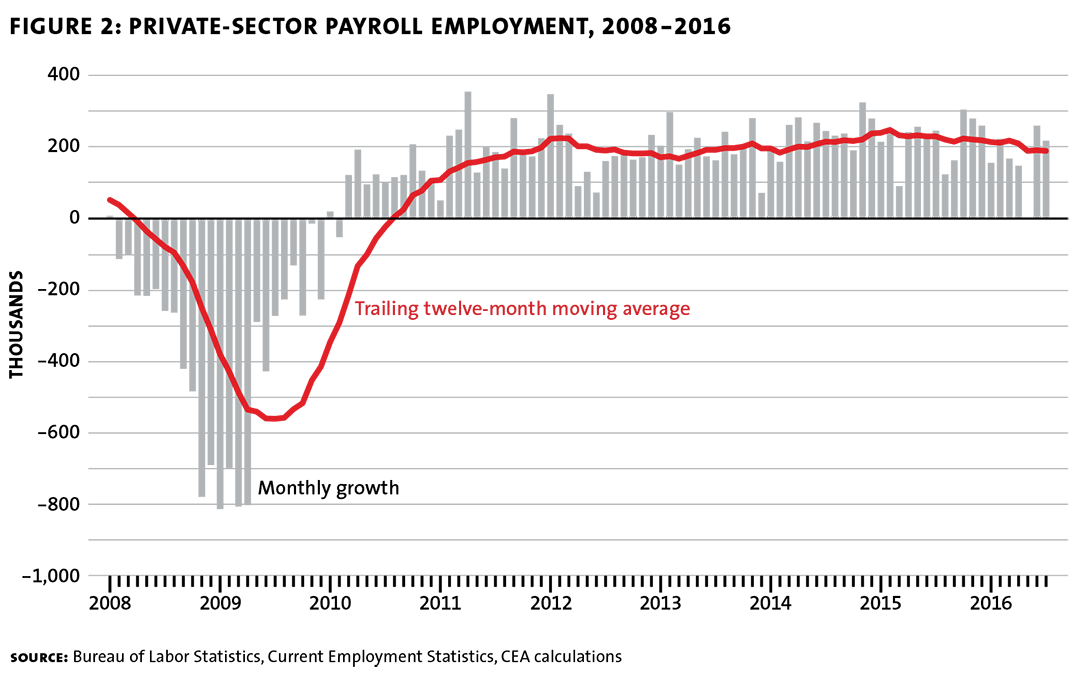 Payroll job growth is less volatile than productivity growth and thus can be examined in the context of a shorter window like the 12-month trailing moving average shown in Figure 2. From 2012 to the end of 2015, the 12-month moving average of private-sector job growth held steady at about 200,000 per month – a much more accurate picture of the economy than the excessive optimism suggested in the many months when job growth came in above that average or the excessive pessimism of news reports in the many months when job growth fell well short of that average.