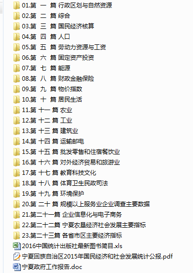 《宁夏统计年鉴2016》是由宁夏回族自治区统计局、国家统计局宁夏调查总队联合编队非国统计出版社公开出版发行的一部全面、系统、客观反映宁夏经济和社会发展的资料性年刊,资料共分为二十三部分:1.行政区划与自然资源;2.综合;3.国民经济核算;4.人口;5.劳动力资源与工资;6.固定资产投资;7.能源; 8.财政金融保险;9.物价指数; 10.居民生活; 11.农业; 12.工业; 13.建筑业; 14.运输邮电; 15.批发零售贸易和住宿餐饮业; 16.对外经济贸易和旅游业; 17.教育科技文化; 18.体育卫生民政司法; 19.环境保护;20.规模以上服务业企业调查主要数据;21.宁夏农垦经济社会发展主要指标;22.各省市区主要经济指标;23.企业信息化和电子商务。