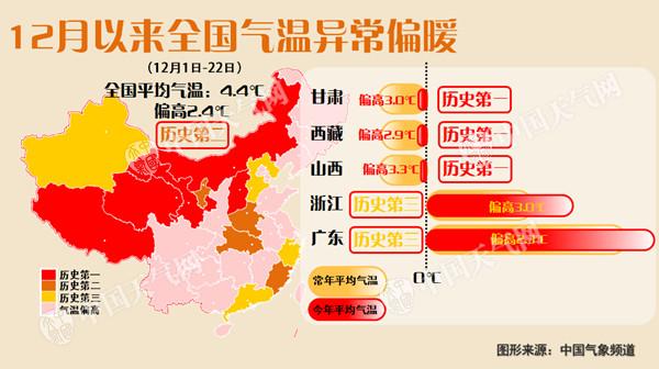 12月以来,我国气温异常偏暖,较常年偏高2.4℃,排在有气象纪录以来第二位。预计随着此次冷空气的到来,气温偏高的局面将有所改变。
