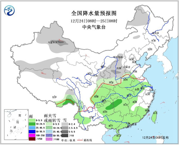 中央气象台预计,24~26日,我国中东部地区将有一次大范围雨雪天气过程。西北地区东部、华北、黄淮等地将有小到中雪或雨夹雪,局地有大雪;南方大部有小到中雨。