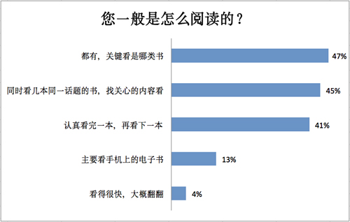 “书到用时方恨少”,所以,“工作需要”成为企业管理者读书最重要动因,。绝大部分读者是利用“睡觉前”、“周末有空时”进行阅读的,其次是“机场或其他等待时间”、“出差”和“上班路上”。此外,如何阅读一本书“主要取决于图书的种类”,“针对同一主题同时浏览几本相关的书”,或“认真看完一本书再另一本”的情况都比较多。