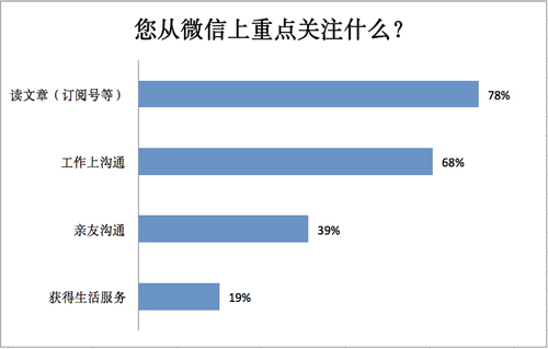 结果显示,这群具有阅读习惯的企业读者,约有六成被访者每天使用微信超过1小时,主要用于“工作沟通”和“读文章(订阅号等)”。