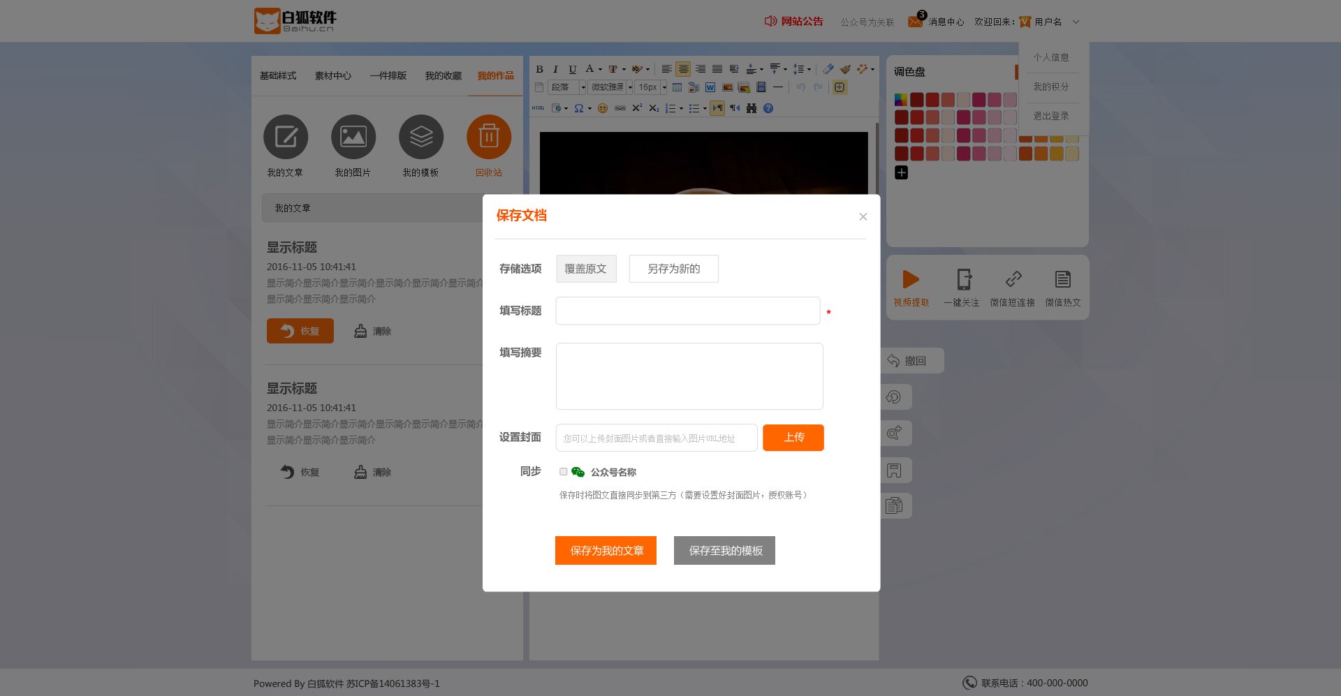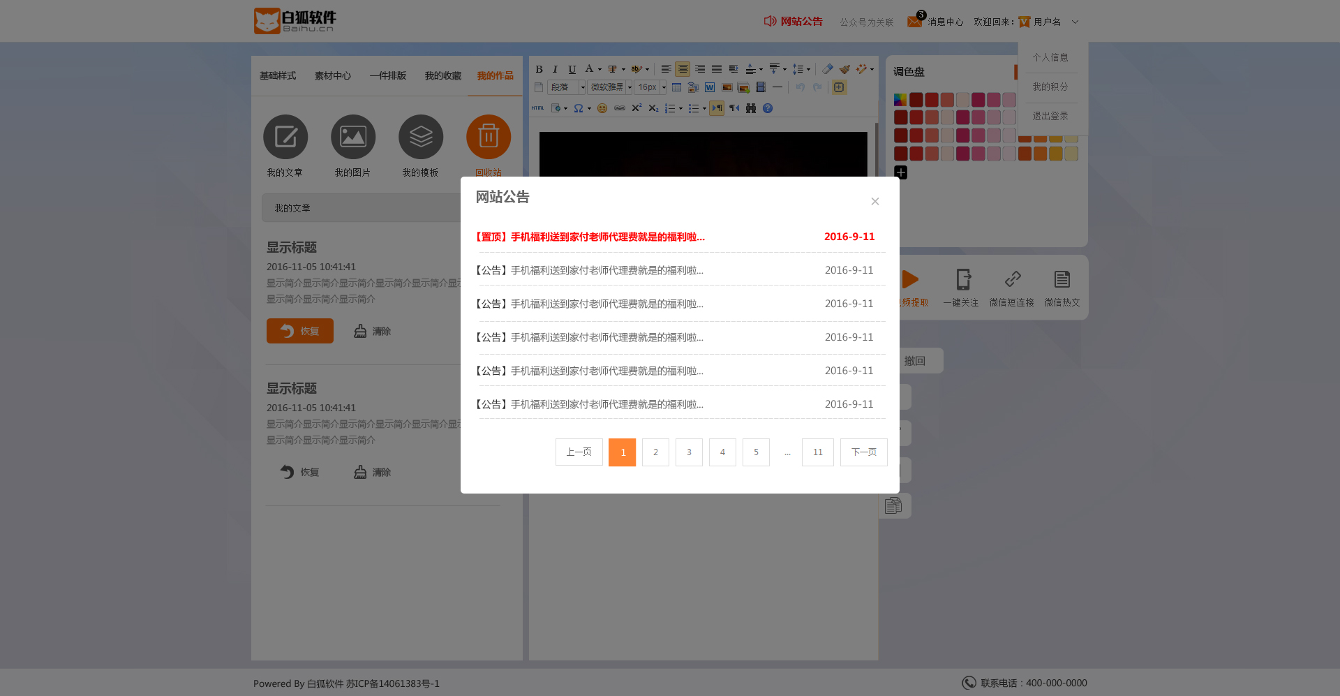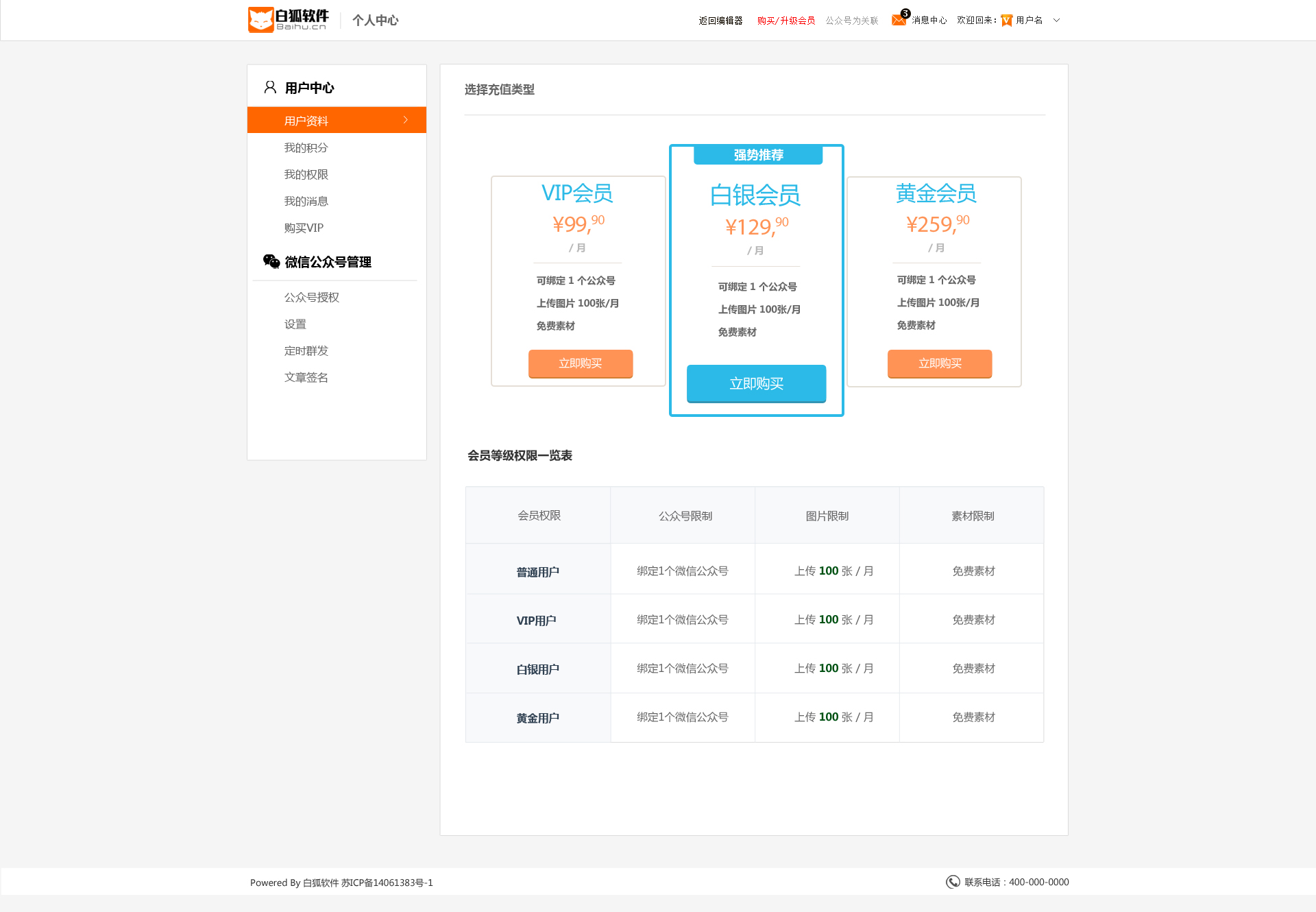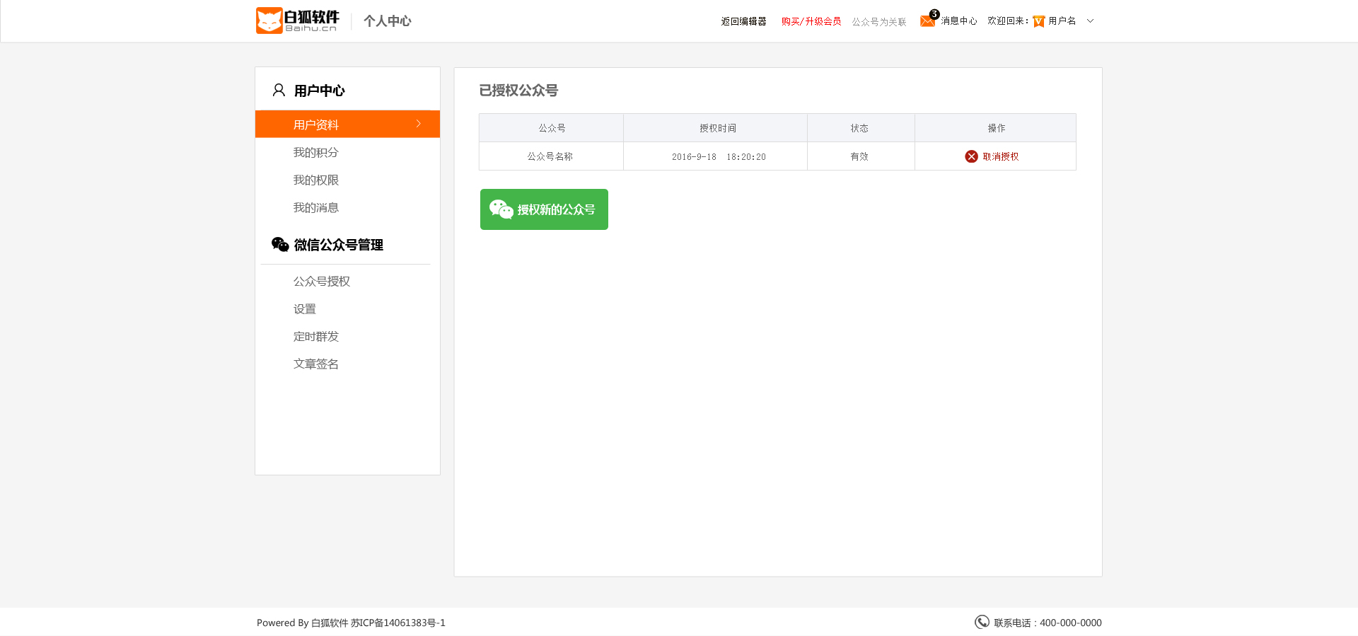 白狐微信助手管理系统,包括了会员、积分、素材、模版、订单、支付、微信图文排版、样式换色、公众号授权管理、图文同步,定时群发等,支持第三方登录和支付宝、微信等快捷支付。后台支持素材管理、会员管理、积分管理、价格管理、信息管理等。