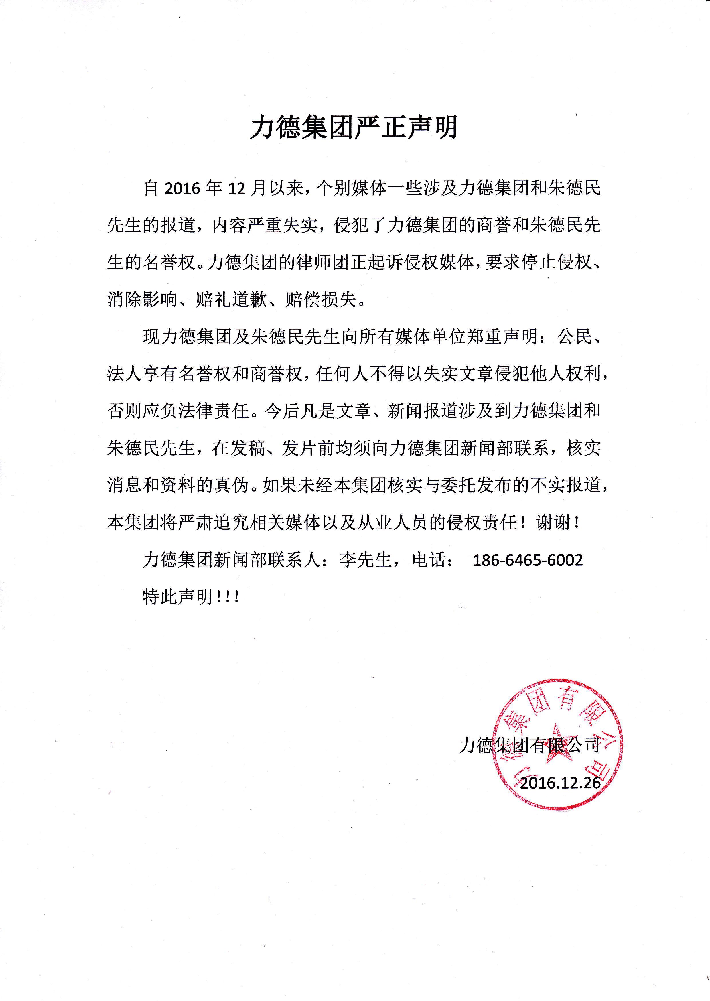 关于力德集团对近期遭受不实报道的严正声明