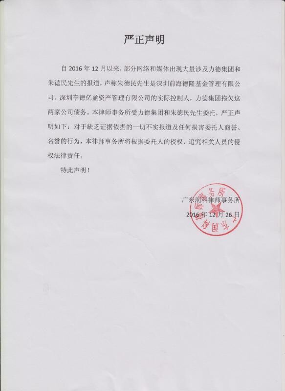 亨德金融集團的實際控制人投資失敗,將無法償還給投資人本金的債務危機轉嫁給力德集團”的不實報導之聲明