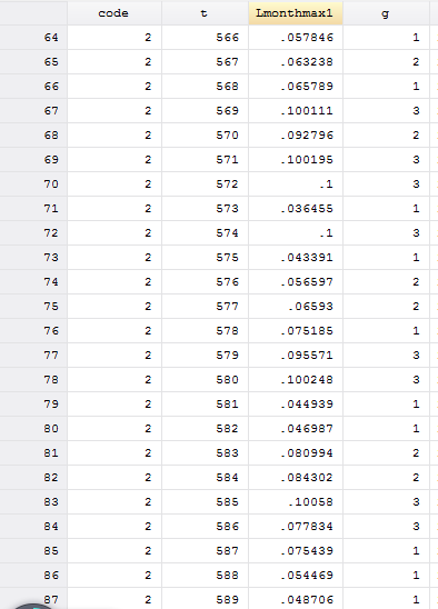 我想把每一个code中前60个月(月份变量为t)进行回归(Lmonthmax1为被解释变量 g为解释变量) 应该要怎样筛选 举个例子:以86行数据为例 我想选取第26行-85行的数据进行回归 命令如何 现在我写的是bysort code:reg Lmonthmax1 g if 。。。这里怎么补充上所要的筛选的条件