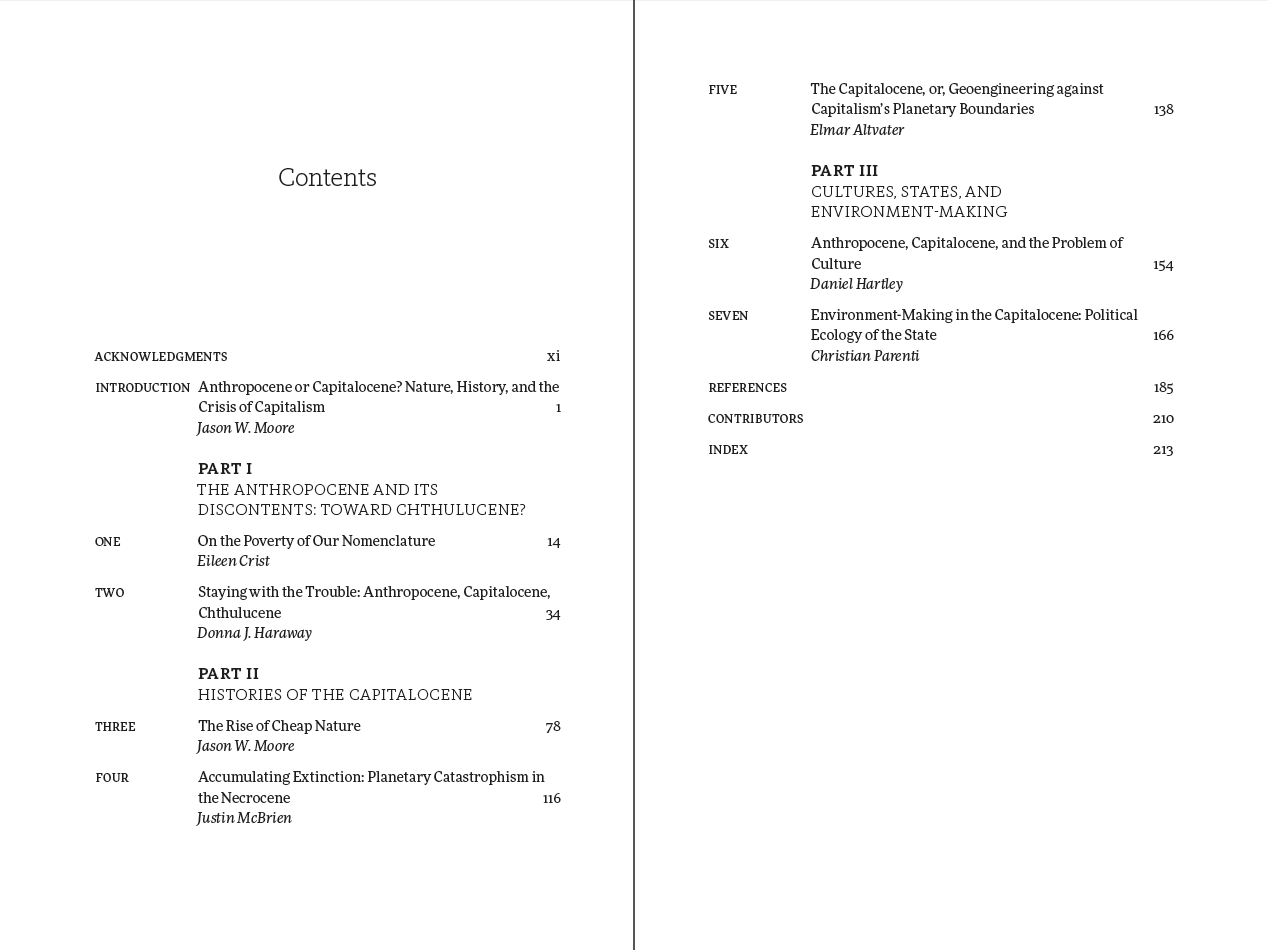 Anthropocene or Capitalocene? offers a series of provocative essays on nature and power, humanity, and capitalism. Including both well-established voices and younger scholars, the book challenges the conventional practice of dividing historical change and contemporary reality into “Nature” and “Society,” demonstrating the possibilities offered by a more nuanced and connective view of human environment-making, joined at every step with and within the biosphere. In distinct registers, the authors frame their discussions within a politics of hope that signal the possibilities for transcending capitalism, broadly understood as a “world-ecology” that joins nature, capital, and power as a historically evolving whole.