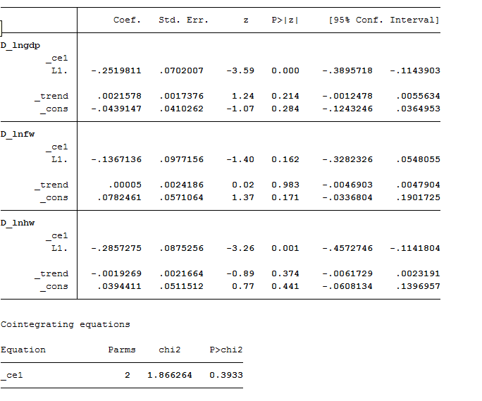 请教vec的输出结果怎么看?如何写出协整关系的方程? 跪谢!