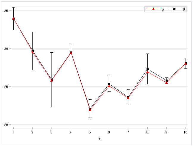 series x=t y=a/markers markerattrs=(symbol=trianglefilled color=red) name="sa" lineattrs=(color=red);