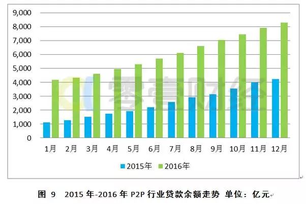 2016年P2P行业活跃投资人数估计在998万左右,较2015年(720万人)增加38.6%;人均投资额为19.6万元,同比增加45%。近两年投资人数量走势如图13所示,相较于2015年,2016年各月投资人数量环比增长不明显,主要因为随着行业的逐渐成熟,P2P平台获客的边际效应显现。