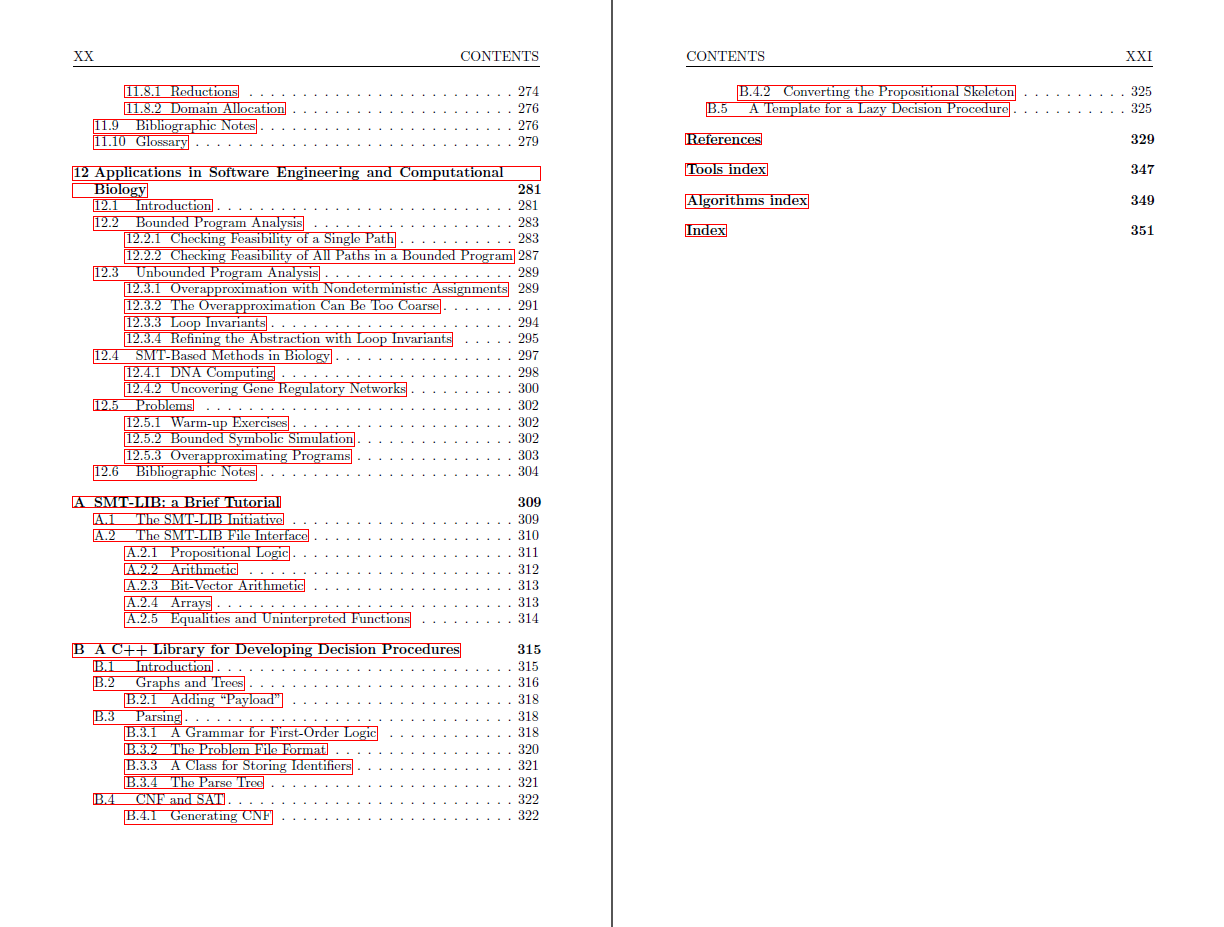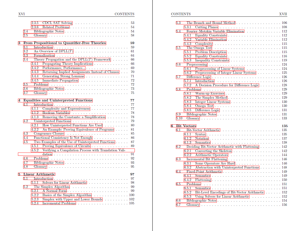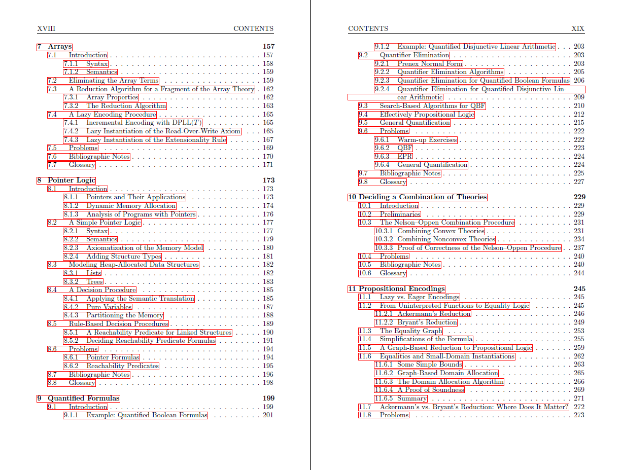 The authors introduce the basic terminology of SAT, Satisfiability Modulo Theories (SMT) and the DPLL(T) framework. Then, in separate chapters, they study decision procedures for propositional logic; equalities and uninterpreted functions; linear arithmetic; bit vectors; arrays; pointer logic; and quantified formulas. They also study the problem of deciding combined theories based on the Nelson-Oppen procedure.