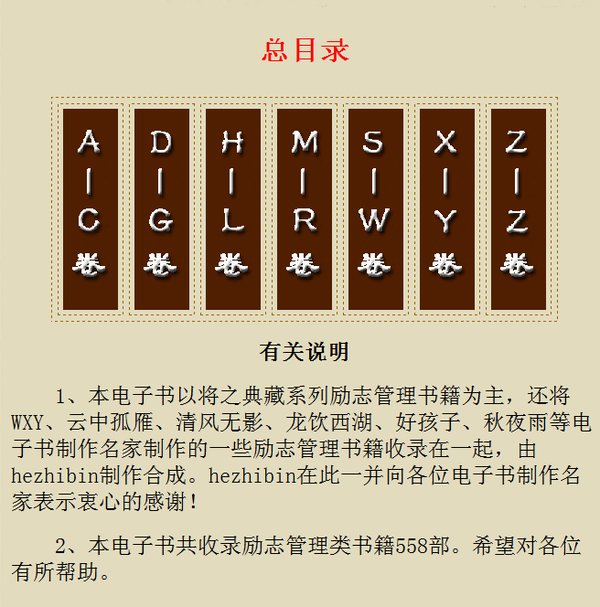 1、本电子书以将之典藏系列励志管理书籍为主,还将WXY、云中孤雁、清风无影、龙饮西湖、好孩子、秋夜雨等电子书制作名家制作的一些励志管理书籍收录在一起,由hezhibin制作合成。hezhibin在此一并向各位电子书制作名家表示衷心的感谢!