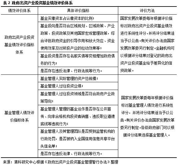 国家发展改革委将建立并完善对ZF出资产业投资基金和基金管理人的绩效评价指标体系。对于产业投资基金的绩效考评,《办法》并未对基金的经济绩效指标(即投资业绩指标)作过多规定,而将评价重点落在对政策引导效果和社会经济效益等方面,如基金投向、引导和放大效果、资金使用效率和对产业拉动效果等;对于基金管理人的评价指标设置,监管机构则主要关注投资能力、过往投资业绩和该基金管理人的投资运作等行为是否合法合规。此外,《办法》还指出国家发展改革委每年将根据评价指标对ZF出资产业投资基金和基金管理人绩效进行系统性评分,并将评分结果适当予以公告。金融机构可以根据评分结果对登记的ZF出资产业投资基金给予差异化的信贷政策,各级ZF部门可以根据评分结果选择基金管理人。