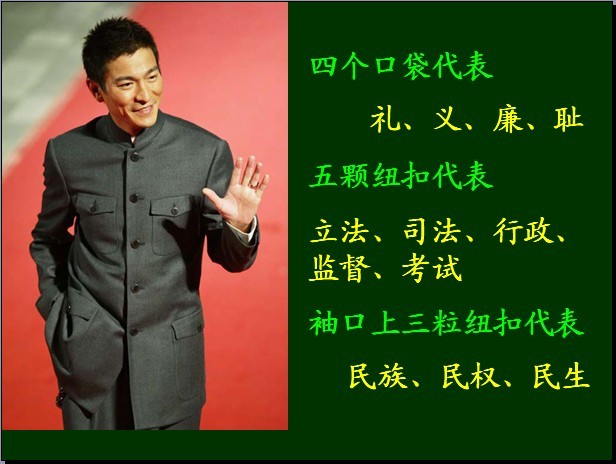 yesiami 发表于 2009-7-30 16:15 其一,前身四个口袋表示国之四维(礼、义、廉、耻)。 其二,门禁五粒纽扣区别于西方的三权分立的五权分立(行政、立法、司法、考试、监察)。 其三,袖口三粒纽扣表示三民主义(民族、民权、民生)。 其四,后背不破缝,表示国家和平统一之大义。