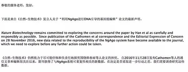 “《自然-生物技术》仍然致力于尽可能仔细和负责任地探究围绕韩春雨等人论文的担忧。 自2016年11月28日发布Cathomen等人的通信文章和编辑部关注以来,期刊获得了与NgAgo系统可重复性相关的新数据,在决定是否采取进一步行动之前,我们需要调查研究这些数据。