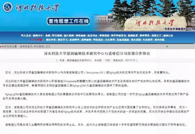 另据河北科技大学官网1月19日消息,该校副教授韩春雨团队发现的NgAgo-gDNA基因编辑技术工具在丹麦诺维信公司的真菌表达系统中已经展现出潜力。诺维信公司对进一步开发NgAgo基因编辑技术并将其应用于新产品的开发有浓厚兴趣。近日,河北科技大学基因编辑技术研究中心与丹麦诺维信公司(Novozymes A/S)就NgAgo技术的应用与开发达成合作,并签署协议。