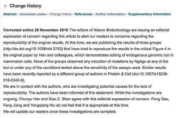 2016年11月28日,《自然-生物技术》在韩春雨课题组的在线论文后更新了“编辑部关注”。