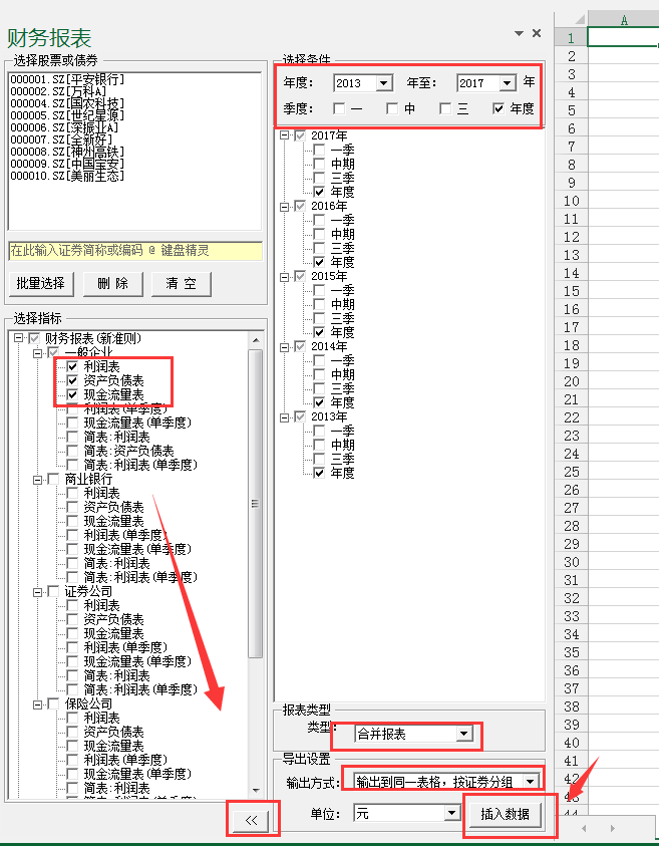 勾选所需要的财务指标,点击向右的箭头,选择报告期以及报表类型,设置好输入方式后,点插入数据