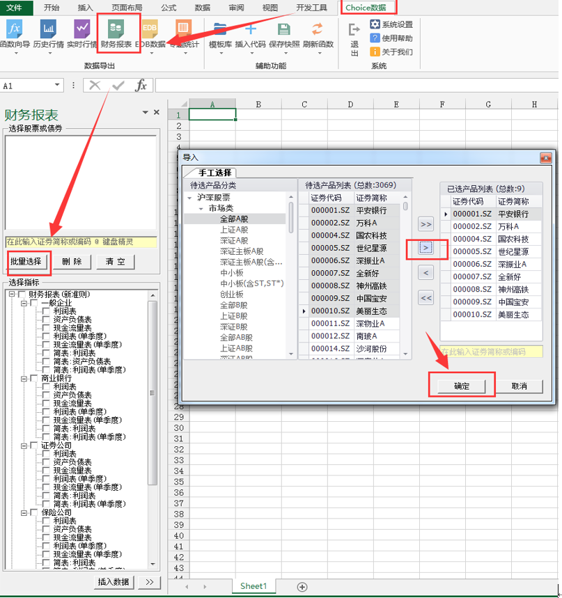 点击财务报表-批量选择,选取所需要的成分,点确定