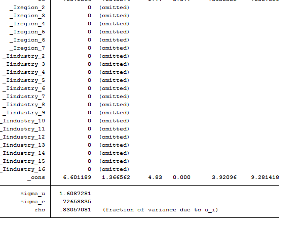 当然,若使用 xtreg tobinq fem numexe lev size age ls i.region1 i.industry1 ,fe r 那么 region1 和industry1的虚拟变量将会omitted 。或者使用reg tobinq fem numexe lev size age ls i.number i.region1 i.industry1 , r也就是LSDV估计法时,会出现类似的情况,一定会有7+16=23个虚拟变量会omitted (这个跟 i.number i.region1 i.industry1 在reg里的顺序有关的,在这个排序里i.region1 i.industry1将会omitted ;若排序是这样的reg tobinq fem numexe lev size age ls i.region1 i.industry1 i.number , r 那么i.number里将有23个虚拟变量会omitted )。