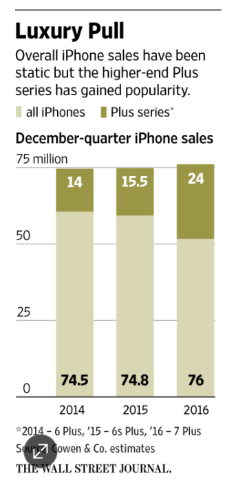 The strategy appears to be working. Cowen & Co. estimates the 7 Plus accounted for about 40% of the roughly 58.5 million total iPhone 7 devices it estimates Apple sold world-wide in Apple’s fiscal first quarter, which ended in December. That is a 17 percentage-point jump from the 23% who opted for its larger predecessor, the 6s Plus, in the same quarter the previous year.