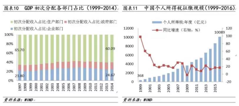 六是中国家庭部门最轻松的税负阶段将迅速成为过往,税收和死亡是必可避免的趋势。和西方国家相比,中国家庭部门的税负是非常轻的,这个基本事实可能许多国人并不认同。中国税制的特点是名义税率重,实际税率不重;所得税地位不重,流转增值等间接税税负过重;企业税负重,居民税负不重、相比工薪阶层,巨富阶层的税负可能更为轻微。过去20年,从GDP初次分配看,企业占20-25%,家庭部门尽管占比下降仍占近60%;但从税收占比看,企业贡献了近70%,家庭部门贡献仅约12%。直到2016年,中国政府征缴的个人所得税也仅刚突破1万亿元。高收入人群的税负过轻和敛财过速是平行的。如果企业税负无法更沉重,那么家庭部门的税负必然显著增加。在未来,涉及个人税负的“三重门”将陆续出现,即遗产税,房产税和更完善的个人所得税。无论如何,家庭部门税负整体过轻,结构失衡的状况无法延续。