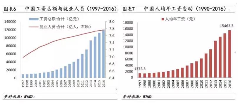 四是中国人最显著的收入增长期似乎也已远去,涨工资越来越难了。过去20年是中国普通劳工收入增长最显著的一段岁月。从国家的角度看,1997年中国的外汇储备只有1400亿美元,而现在即便是告别了2014年的外储高峰,也还是有3万亿美元外储的,涨了20倍。从工薪族的角度看,1997年城镇职工大约7亿人,当年工资总额9602亿元,折合年工资收入仅为1380元,月薪也就120元。到2016年估计城镇职工约7.9亿人,工资总额达12万亿,折合年和月工资分别为1.5万和1250元。上述数据可能和普通民众的直观感受不一致。尽管如此,从不太靠谱的数据看,20年中国经济增长10倍,职工工资也增长了10多倍。其实当下普通工薪族月薪在3-5千,京沪等一线城市中位数月薪大约为1万元。普罗大众尚且如此,中国富裕阶层的财富积累显然更为惊人。万元户已作古,人生小目标才有些气魄。在未来,中国人口红利的远去和劳动力成本的不断攀升,使得收入增长必然随着经济成长回落的大势而不再汹涌。