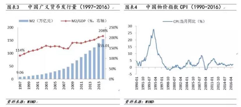 二是中国人民币大发行的洒钱阶段可能已一去不复返。几乎每个中国人都在感叹货币如潮水一样涌来。在过去20年中国央行所发行的人民币规模,折合成美元,可能比地球上所有其他经济体加总起来还要多。这种快速发钞可能顺应了中国货币化和城市化的进程,但也可能存在着以超长周期的扩张性货币政策,支撑和强化了超长周期的经济增长。在1997年之际,中国的广义货币M2仅为9.1万亿,相当于当时GDP的115%,而到了2016年底,M2已是155万亿,相当于GDP的两倍。如此超级货币周期恰好搭配了史无前例的庞大工业化、现代化进程,保证了中国物价指数CPI的中枢水平不升反降。这一点可能和普通民众的直观感受相悖。在90年代中国还是很容易遭遇5%以上的物价涨幅,而近年来,3%的CPI都不多见了。庞大而廉价的消费品滚滚而来。这种发钞节奏,决定了存钱不如借钱,借小钱不如借大钱,冒险者迅速攫取了谨慎者的财富。在未来,我们已不能指望央行再度任性发钞。