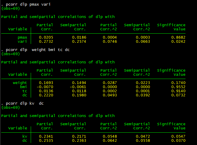 我做dlp和pmin pave pmax vari weight height bmi tc kv dc percent scantimes dothr的相关性分析,使用 pwcorr dlp pmin pave pmax vari weight height bmi tc kv dc percent scantimes dothr, sig star(.05)命令,得出dlp和pmax vari weight bmi tc kv dc具有相关性