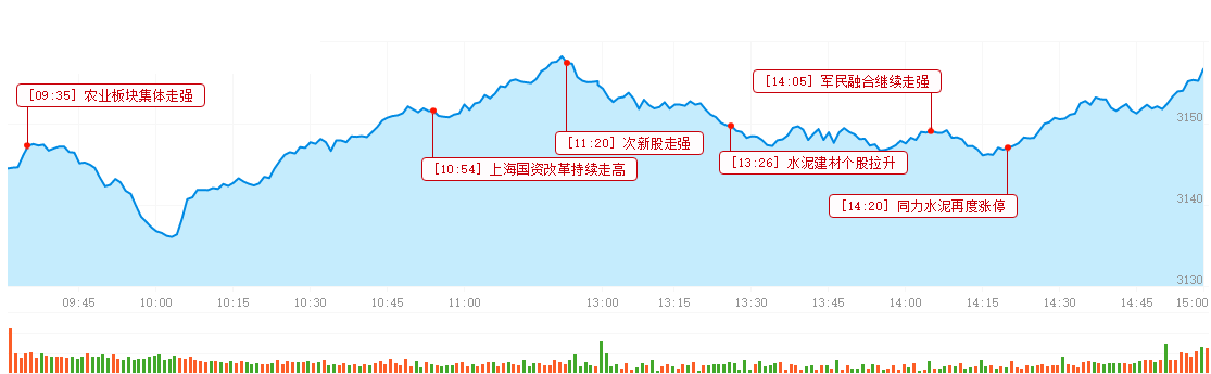 今日沪深两市股指开盘涨跌不一,但随后的走势极为相似,全天整体上呈现出在震荡中走高的格局,成交量较前几个特殊的交易日有所回升。在三大股指中,创业板指今天最为强势,全天上涨超1%,成功收复1900点大关。截至发稿,沪指上涨0.54%,报收3156点;深成指上涨0.74%,报收10078点;创业板上涨1.26%,报收1900点。从盘面上看,次新股、仪器仪表、建筑装饰、农机等板块涨幅居前;两市仅在线旅游、钢铁、特钢三个板块下跌,其余板块全线上涨。沪股通净流入21.5亿,深股通净流入7.4亿。