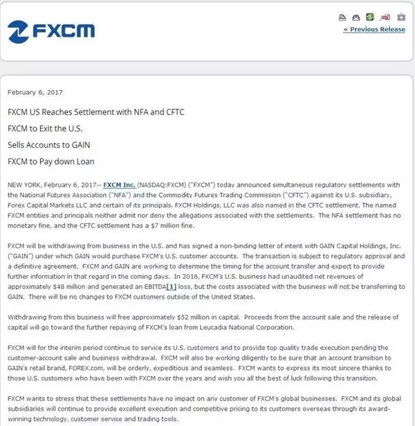 福汇将退出在美国的业务,并已经与嘉盛集团(GAIN Capital Holdings)签署一份不具约束力的意向书,后者将购买福汇的美国客户账户。但目前该交易还未达成一个最终协议,并且之后需要得到监管部门的批准。福 汇和嘉盛正在确定账户转移的时间,预计将在未来几日提供进一步的相关信息。