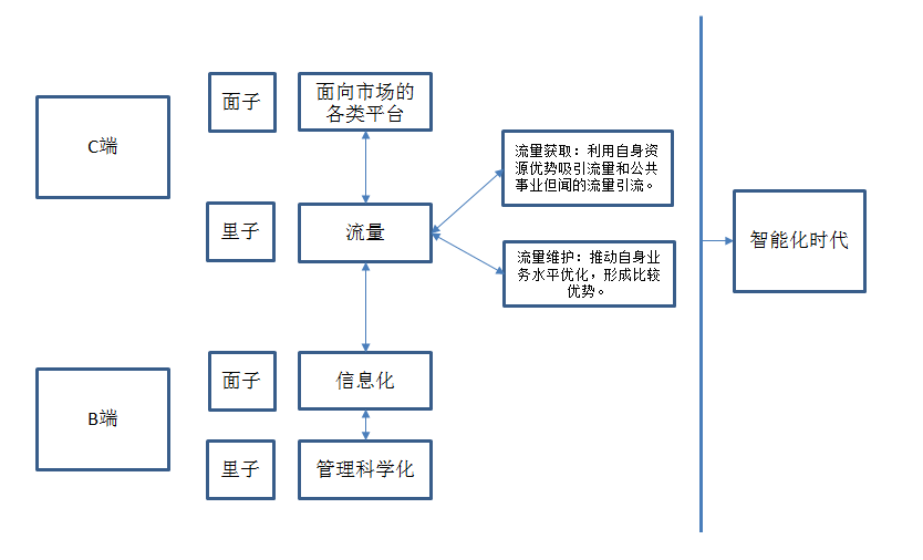 流量的聚集作为商业的优势自古就有,只是互联网的效率作用,让互联网时代的流量聚集更快,从而能够产生爆发性的效果;互联网的透明性能够直击众多线下商业的重重积弊,因此能够切中消费者痛点,形成有效的规模性入口。这两者的结合早就了互联网模式令人炫目的发展效果。要知道从集市到城市的流量积累,人类用了几百上千年;从淘宝到阿里巴巴帝国,马云虽然很艰辛,但不过只是十几年。这种效率,是互联网将入口+流量模式引为自身核心要件的原因,也是入口+流量模式要借助互联网来传播自身思维的原因。而现在,随着万物互联时代的到来,入口+流量产生了完全不同以往的进化模式。互联的网络记录下流量的每一个足迹,流量借助网络连接把自身各个维度的行为转化为数据,并借助已经成熟的巨大的存储能力和运算能力,变成智能化的基础素材。在新的时代里,流量正悄然的变成大数据,更进一步的形成人工智能。拥有这些流量的企业,借助流量形成的数据和流量变现带来的巨大财富,建构基础设施,建立深度学习算法,搭建更快速便捷的网络,迅速变成高科技的智能公司,这是马云声称阿里巴巴不是一家电子商务企业甚至要在2017年摈弃电子商务的原因。因为他们已经积累了大量流量,从而可以将流量用来做大数据和人工智能。而没有流量的企业,不但没有作为智能化和大数据的基础素材,甚至由于现金流和利润的不足,连进行大规模信息化建设都捉襟见肘,这是大量传统企业互联网+转型要么连转型的第一步基础设施建设的脚步都迈不开,要么基础设施建完了发现自己仍然是巧妇难为无米之炊的重要原因。