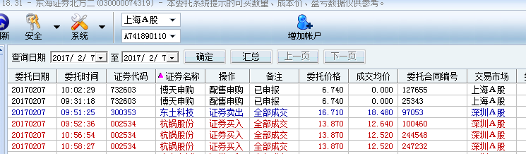 周三集合竞价出来之后,我就把鼠标放在了市价卖出之上。因为杭锅股份它既有可能往上在冲一下,也有可能不冲,直接往下走,所以要做两手准备,如果开盘后往下走,我就立刻点卖出,如果往上走我就会等等再出,所以开盘后一看往下走,立刻就点了卖出。