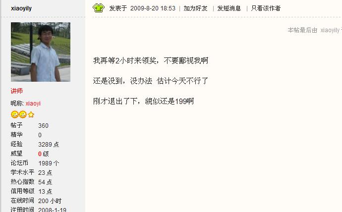 xiaoyily 发表于 2009-8-20 18:53 我再等2小时来领奖,不要鄙视我啊 还是没到,没办法 估计今天不行了