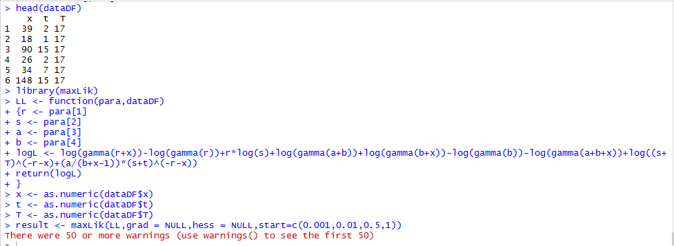 1: In fnOrig(theta, ...) : value out of range in 'gammafn'