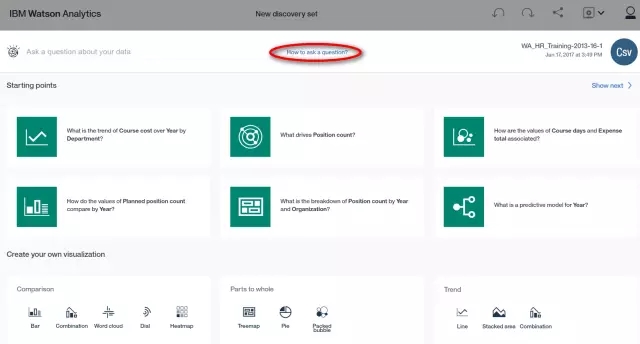 点击文件的标题 -WA_HR_Training-2013-16-1,我们对数据的分析就已经开始了,并且这是一种全新的体验。在以前我们是要向自己提问,通过工具来帮助实现。而现在 Watson Anlytics 向你提问或是你也可以向它提问,而提问之后的分析都会自动实现。