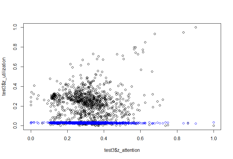 数据的横纵坐标代表的是数据的两个价值维度,数据点越靠近右上角则越优。很明显有三处是集中比较密集的区域,所以我预想的聚类效果应该是这样的: