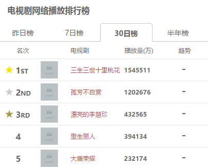 而剧版的《三生三世十里桃花》一路飙升的播出成绩可谓光芒夺目,根据Vlinkage的数据显示:截至2月19日,该剧自播出以来播放量已超154亿次,微博话题#电视剧三生三世十里桃花#的阅读量有72.8亿次,参与话题讨论的人超过3400万人次。