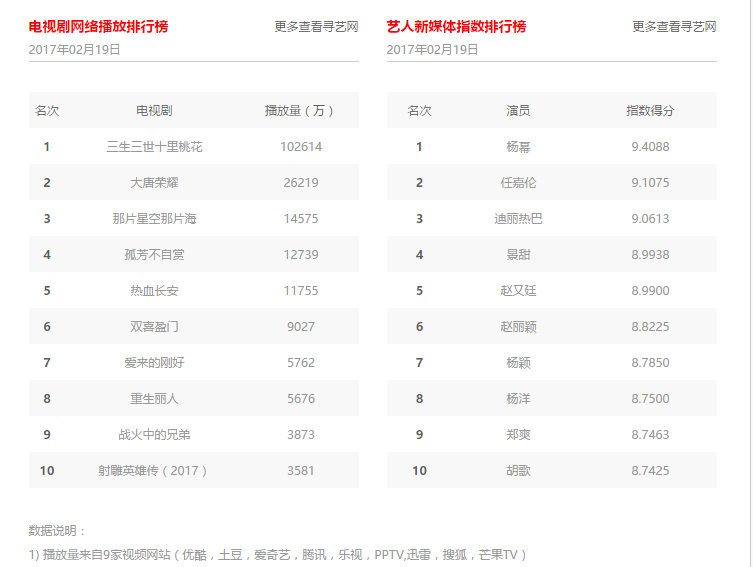 同时剧中主演、角色及剧情不间断霸占微博热门搜索榜单前列,呈现出“按集上热搜”的空前盛况。根据艺人新媒体排行的统计我们可以看到《三生三世》主演杨幂和赵又廷分别上榜,自带话题和流量的“大幂幂”不负众望登上榜首,赵又廷揽获第五。