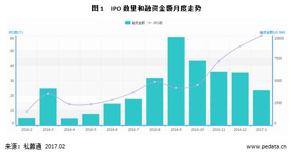 根据清科集团旗下私募通数据显示,2017年1月全球共有60家中国企业完成IPO,IPO数量环比增加13.21%,同比增加757.14%。中企IPO总融资额为39.09亿美元,融资额环比减少33.58%,同比增加593.87%。本月完成IPO的中企涉及20个一级行业,登陆5个交易市场,中企IPO平均融资额为0.65亿美元,单笔最高融资额5.95亿美元,最低融资额450.40万美元。60家IPO企业中32家企业有VC/PE支持,占比53.33%。本月金额最大的三起IPO案例为:中国银河上市(5.95亿美元),中原证券上市(4.04亿美元),九台农商银行上市(3.88亿美元)。
